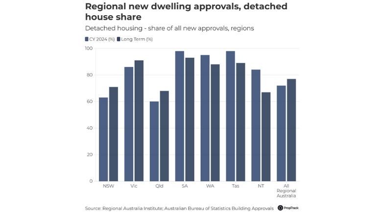 Even though there is demand for smaller homes, the building trends are changing slowly. Data from the Australian Bureau of Statistics and the Regional Australia Institute shows that in 2024, 72% of new homes approved in regional areas were detached houses, only slightly less than the long-term average of 77%.